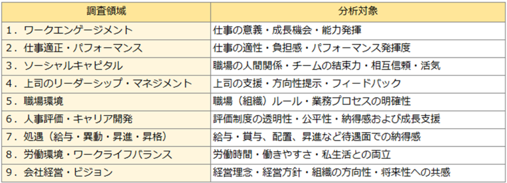「仕事への熱意・没頭・活力」を表す「ワークエンゲージメント」と「会社への愛着・貢献意欲・働きがい」を表す「組織へのエンゲージメント」に必要な要素(調査項目)を、従業員の意識・行動に影響を及ぼす組織内要因の特性ごとに、調査領域として分類し、その特性ごとにエンゲージメント水準を把握します。