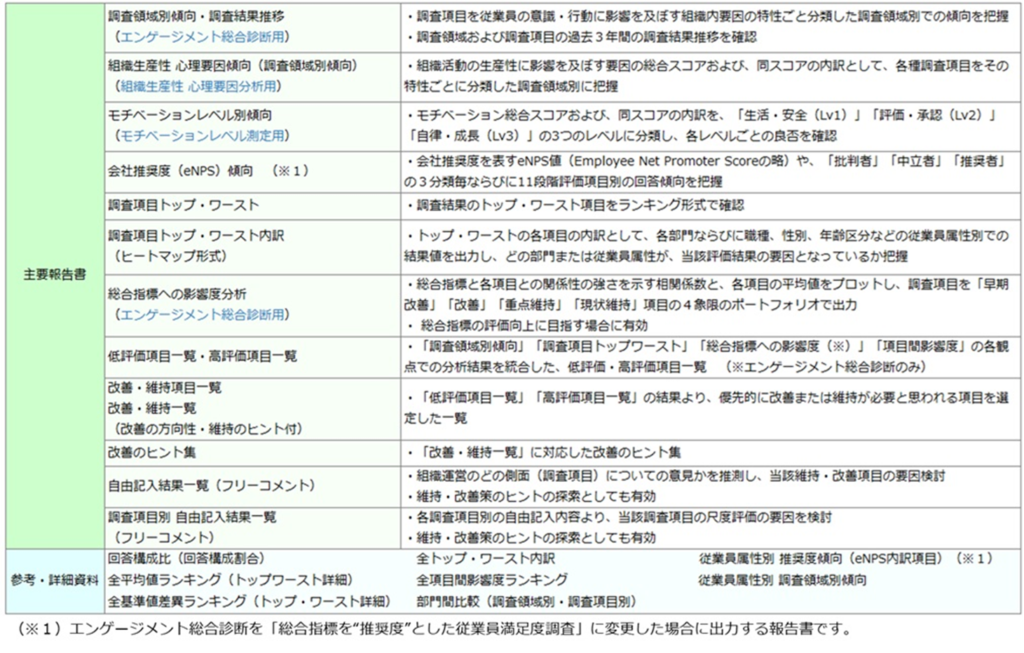 <分析結果報告書一覧>「従業員エンゲージメント総合診断」「組織生産性調査〈心理要因分析〉」「モチベーションレベル診断」共通