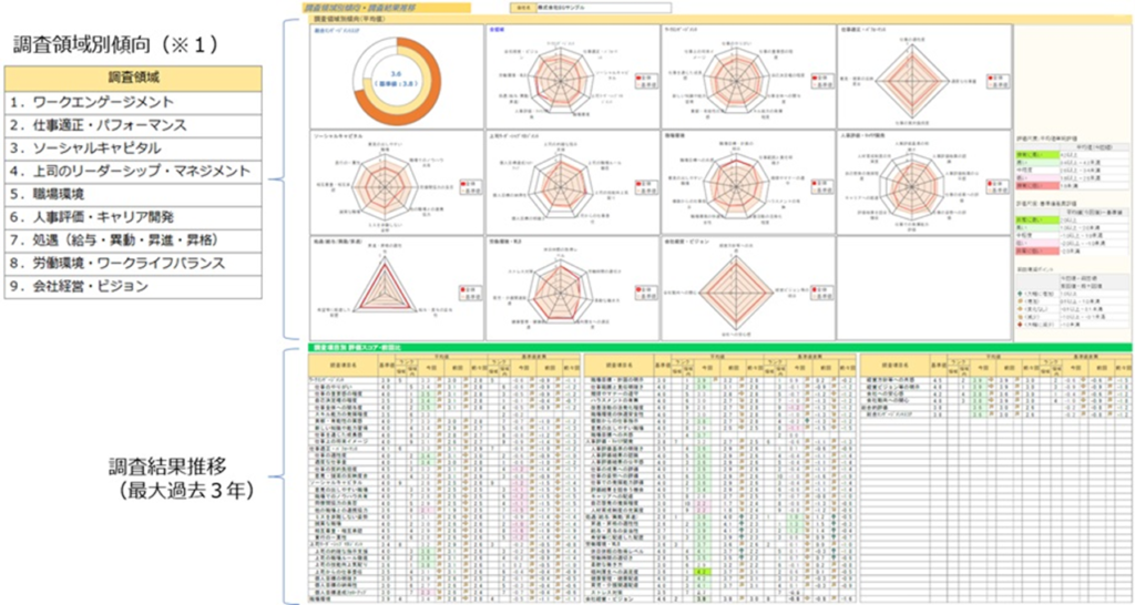 ●調査項目を従業員の意識・行動に影響を及ぼす組織内要因の特性ごと分類した調査領域別および領域内項目の良否を確認します。