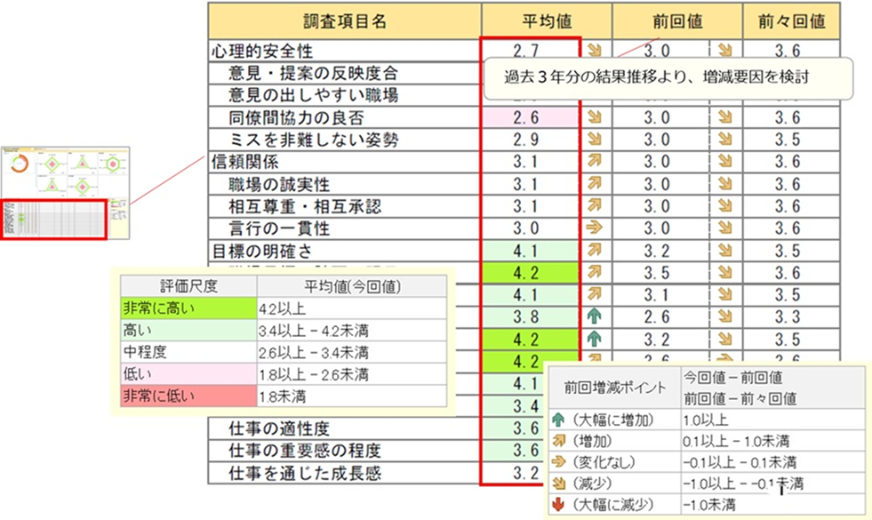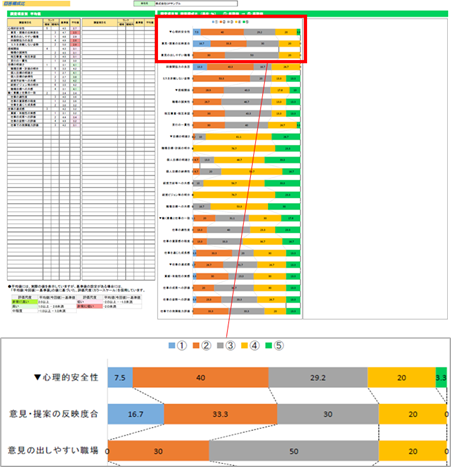 ●調査領域および領域内項目の結果値より、どの領域が高評価か(低評価か)その要因となる領域内項目は何かを確認します。